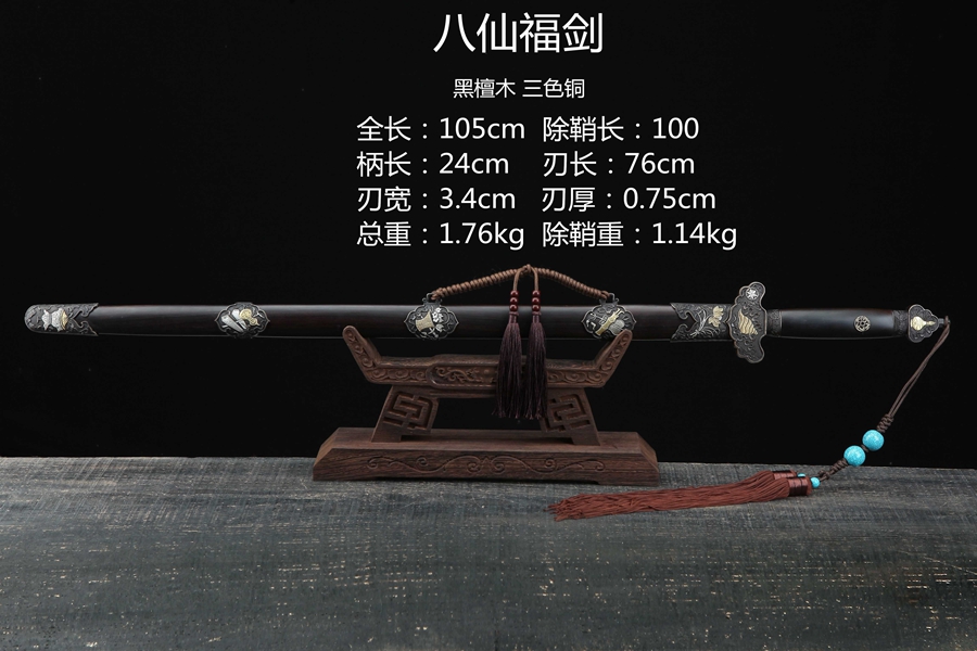 剑鞘:优质黑檀木;剑身:百炼花纹钢、手工锻造、精细研磨09372390。花纹钢烧刃另加155。