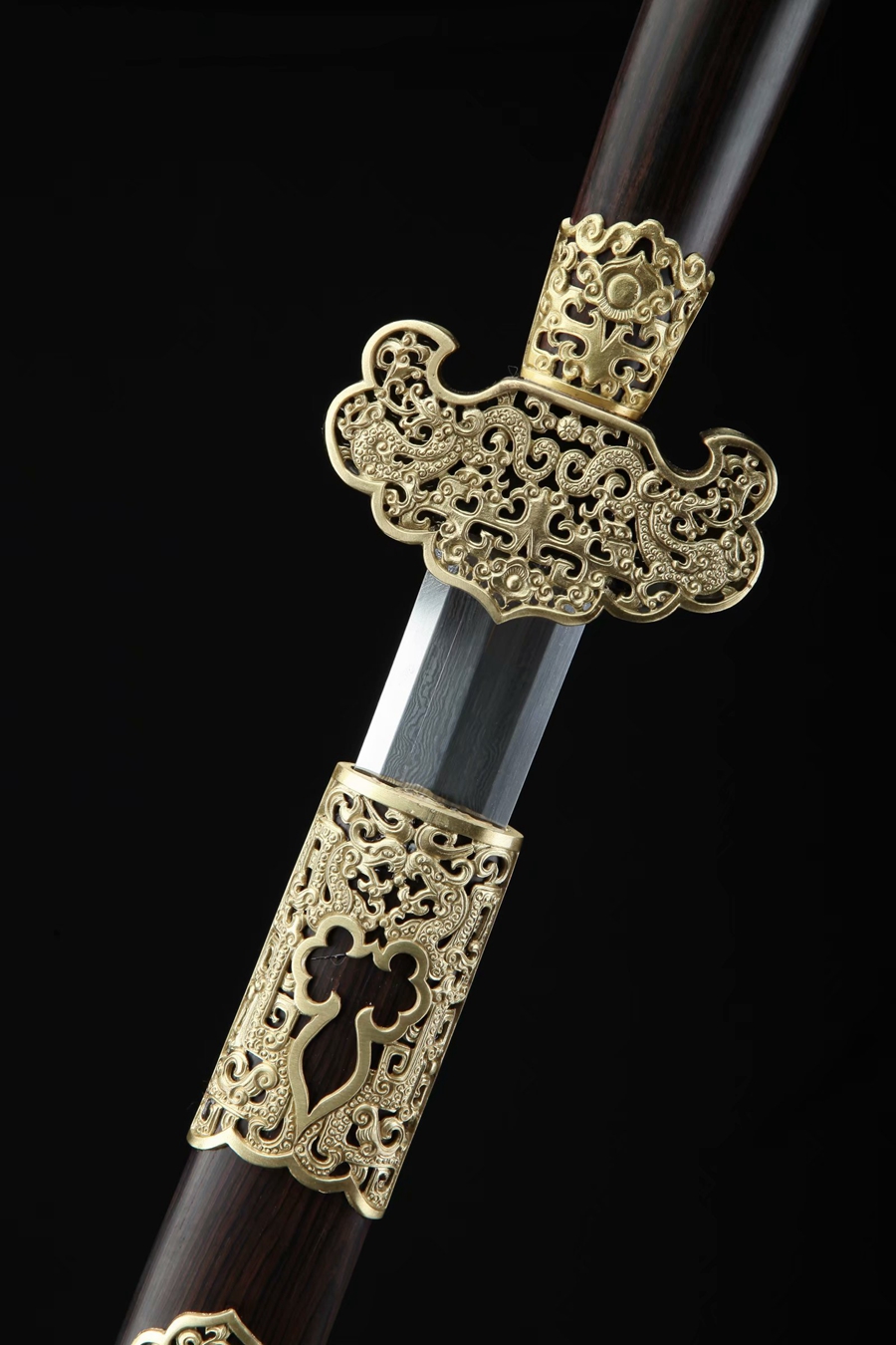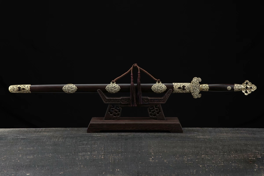 剑鞘:优质黑檀木;剑身:百炼花纹钢、手工锻造、精细研磨08892500。花纹钢烧刃另加155。羽毛纹烧刃另加625。