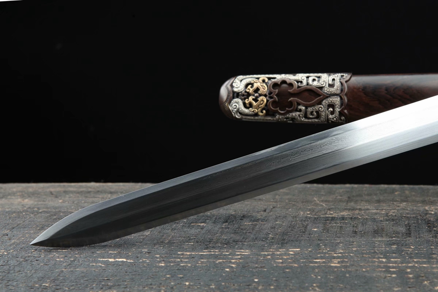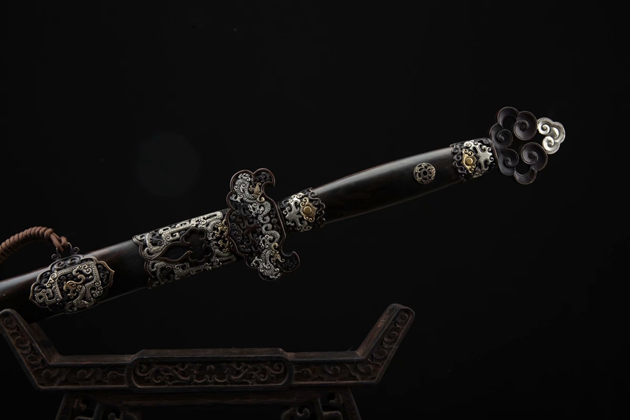 装具:纯铜镂空精雕、古法鎏金、银、古铜三种颜色;剑鞘:优质黑檀木;