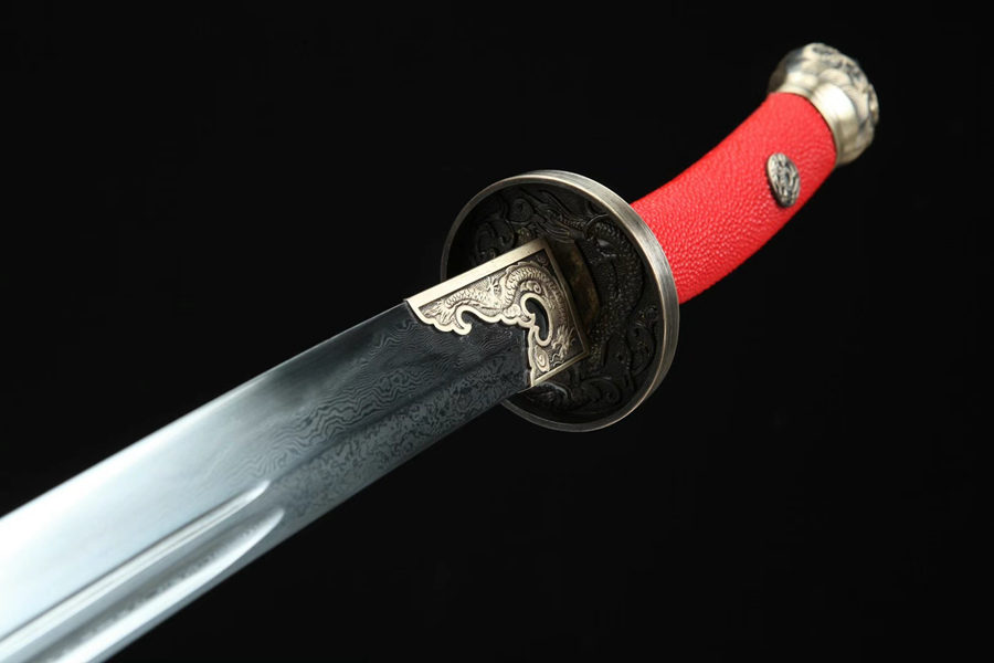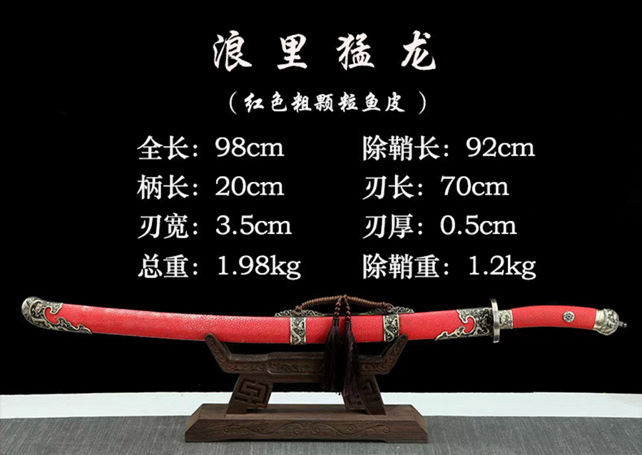 装具:纯铜精雕、精细打磨、做旧;剑鞘:粗颗粒真鱼皮;剑身:百炼花纹钢、手工锻造、精细手磨14582820;花纹钢烧刃另加155。