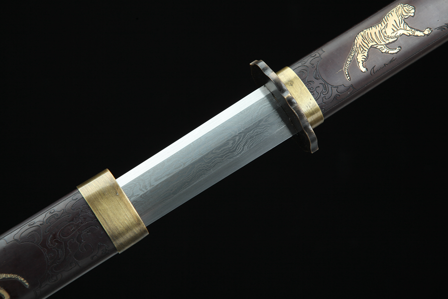 剑鞘剑柄采用纯铜手工包铜、刻花,古法鎏金、银、铜三色、将木梢用铜皮包上后起到防潮防湿、禁锢剑装作用、既美观又不会因天气、时间久远而收缩开裂;剑身:百炼花纹钢、手工锻造、精细手磨16881320。花纹钢烧刃另加115。