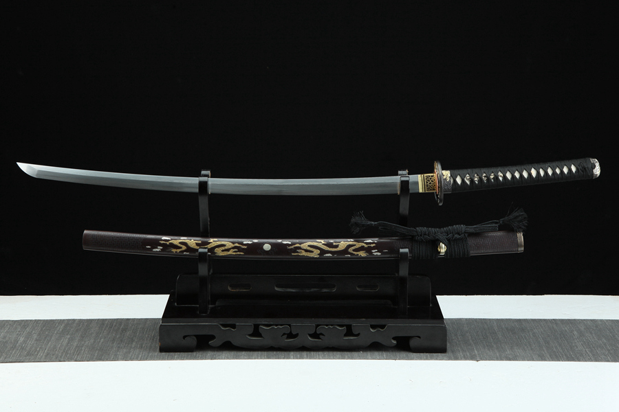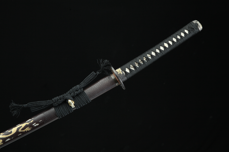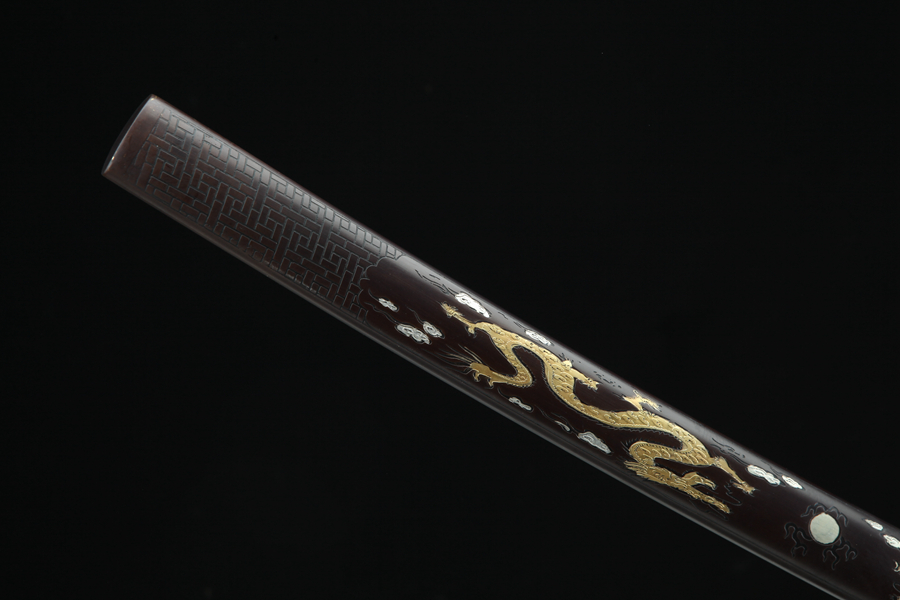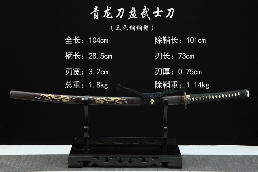 双龙戏珠“青龙刀盘”武士刀(三色铜黄铜鞘)。装具:纯铜精雕、精细打磨、古法鎏、银、古铜三色;刀鞘:纯铜手工包铜、刻花、古法鎏金、银、古铜三色,将木梢用铜皮包上后起到防潮防湿、禁锢剑装作用、既美观又不会因天气、时间久远而收缩开裂;刀身:百炼花纹钢、手工锻造、刀身(四面与开槽可选)精细手磨14631870。花纹钢烧刃另加155。天梯纹烧刃另加375。