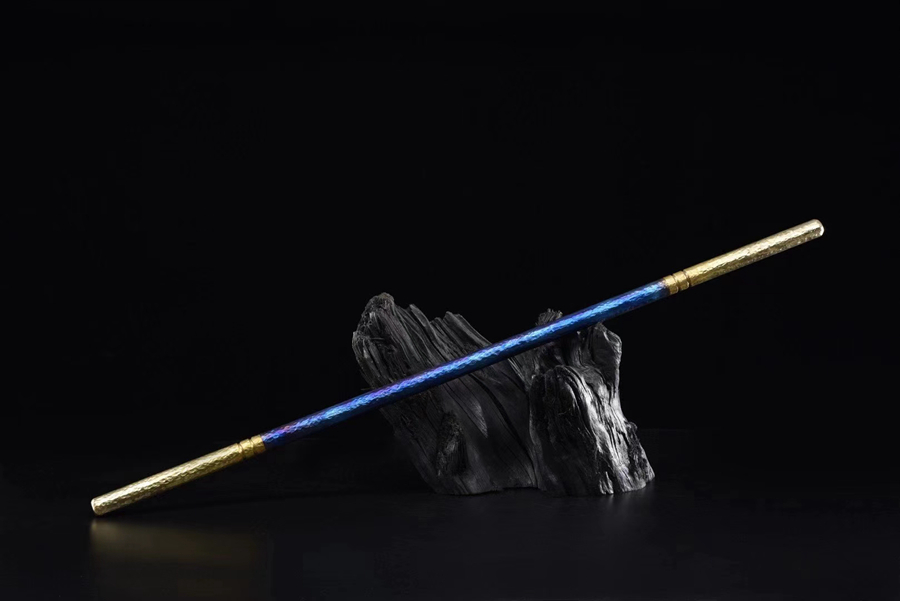 两头金箍棒头纯铜实心手工锤纹,中间钛合金实心手工锤纹烤蓝。钛合金硬.强度高,不锈,耐腐蚀,手感轻巧,可把玩!