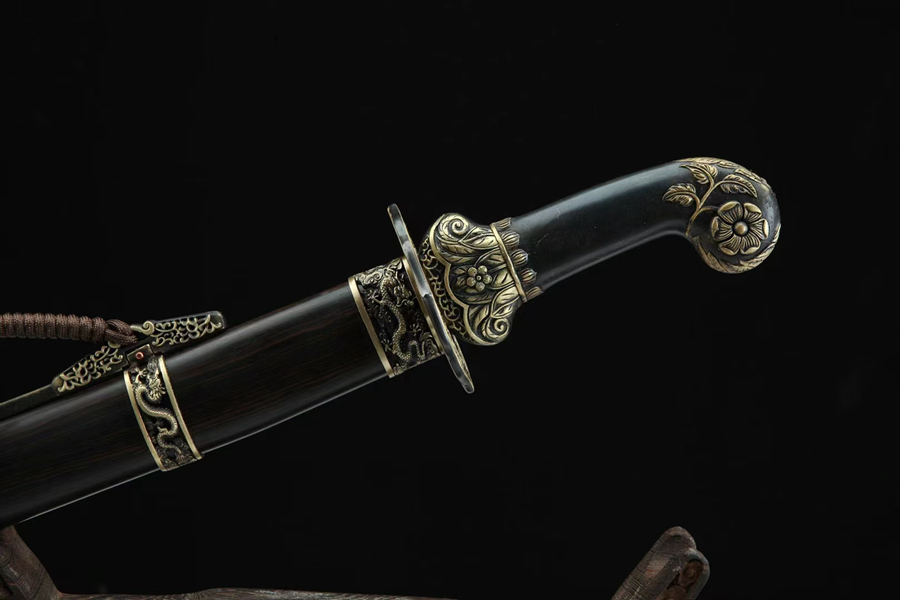 装貝:纯铜镂空精雕、精细打磨、做旧;刀鞘:优质黑檀木;刀身:百炼花纹钢、手工锻造、精细手磨15152120。花纹钢烧刃另加155。