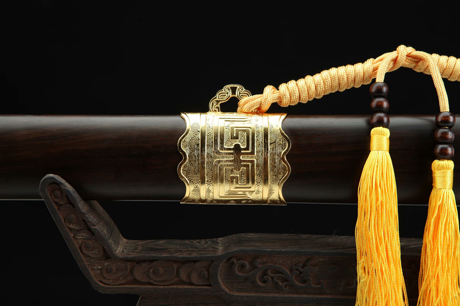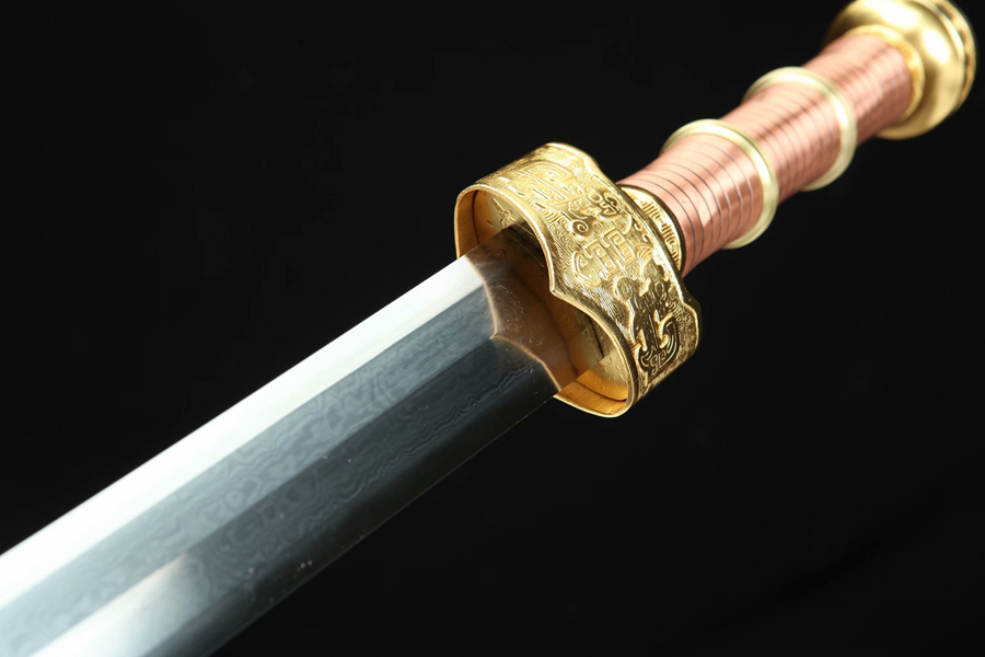 全长:87cm 除鞘长:83cm刃长:60cm 柄长:23cm刃宽:4cm 刃厚:1cm 总重:2.46kg 除鞘重:1.74kg装貝:纯铜精雕、精细打磨、镀24K真金;剑鞘:优质黑檀木;剑身:百炼花纹钢、手工锻造、精细手磨15212000。花纹钢烧刃另加110。