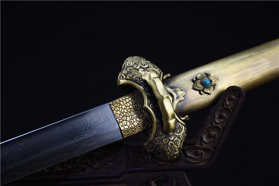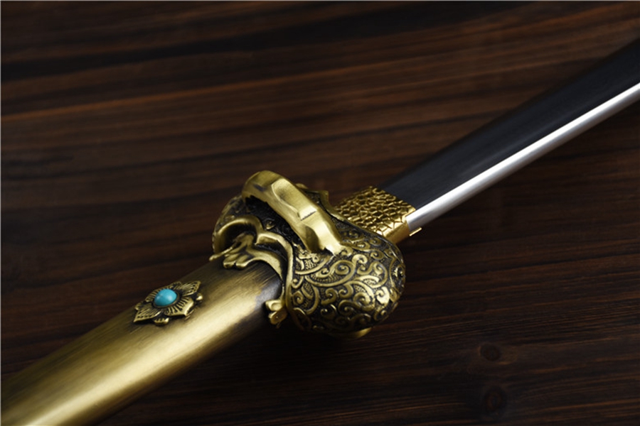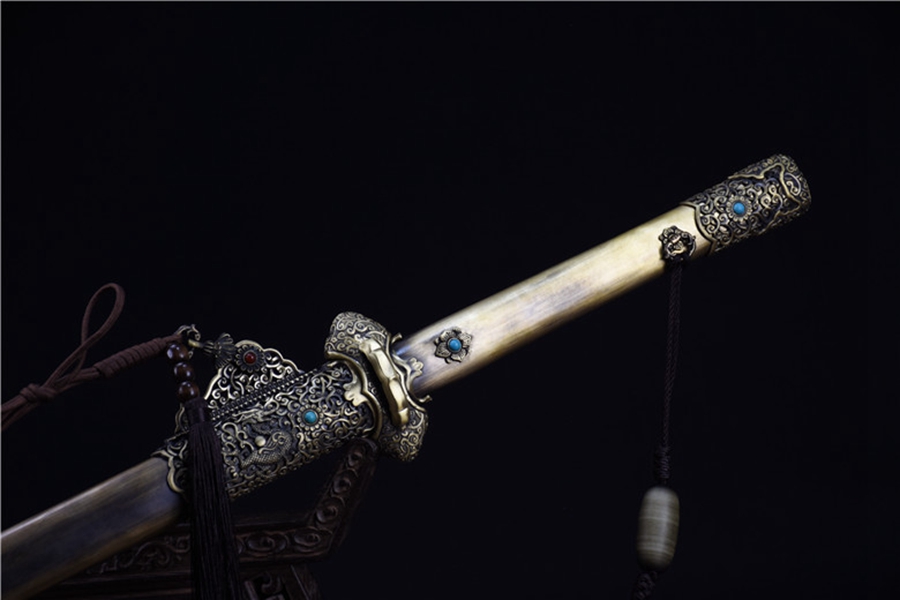 工艺:龙泉传统手工包铜,将铜皮包到鞘上起到保护和禁锢作用,既美观而且不会因为天气潮湿干燥引起的收缩开裂
