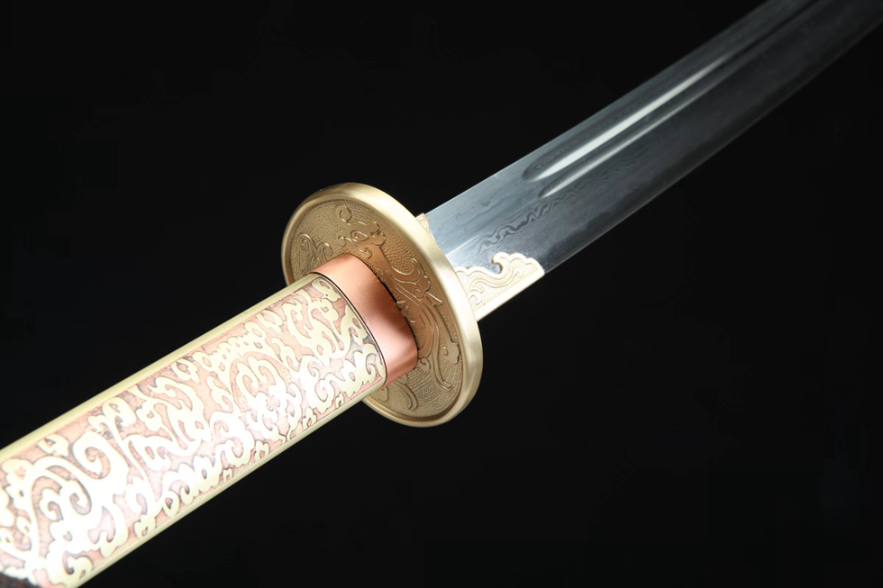 刀鞘刀柄采用纯铜手工包铜、刻花,将木梢用铜皮包上后起到防潮防湿、禁锢剑装作用、既美观又不会因天气、时间久远而收缩开裂、黄铜鞘上镶嵌紫铜、美观素装;刀身:百炼花纹钢、手工锻造、精细手磨17141250。花纹钢烧刃另加155
