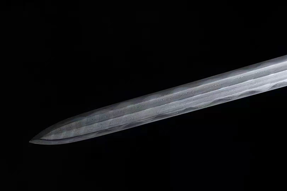 本款采用百炼花纹钢扭转纹锻打,开双槽设计,覆土烧刃工艺,精细研磨。剑鞘采用名贵紫光檀木。
