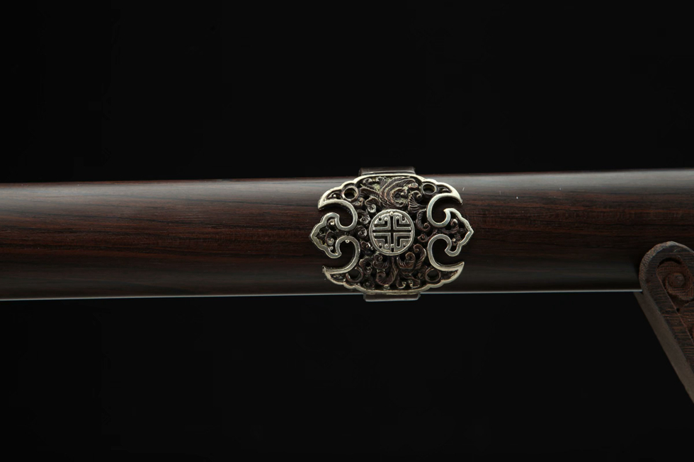 全长:103cm 除鞘长:97.5cm柄长:21cm 刃长:75cm刃宽:3.5cm 刃厚:0.8cm总重:1.8kg 除鞘重:1.12kg装貝:纯铜精雕、精细打磨、古法鎏金、银、古铜三色;剑鞘:优质黑檀木;剑身:百炼花纹钢,手工锻造、精细手磨14182370。花纹钢烧刃另加155。