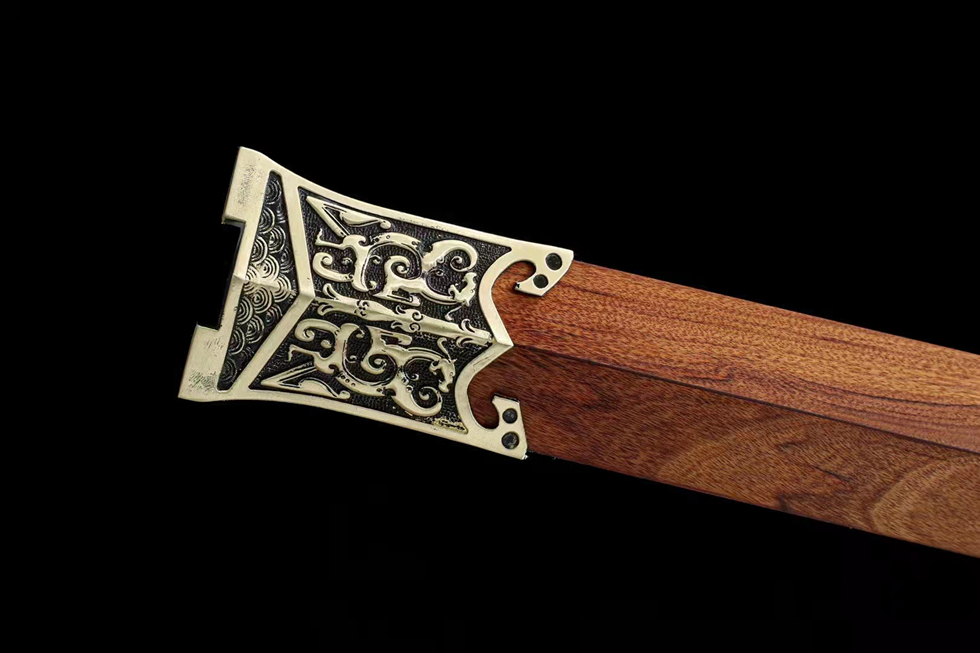 本款由百折钢花纹钢, ,纯手工研磨。装具采用黄铜雕刻,宝石镶嵌。鞘材选用优质酸枝木,木质细腻坚