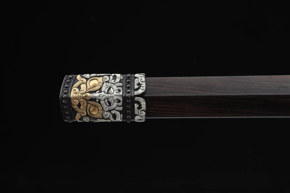 装具:纯铜精雕精细打磨、古法鎏金、银、铜三色;刀鞘:优质黑檀木;