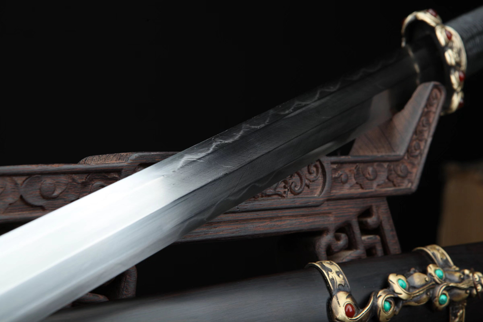 剑鞘:优质黑檀木;剑身:百炼花纹钢、手工锻造、精细手磨18132000。花纹钢烧刃另加155、羽毛纹烧刃另加625