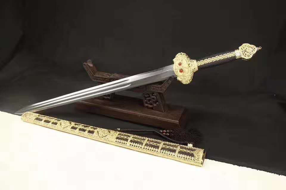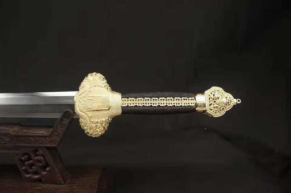 全长:98cm 除鞘长:91 cm刃长:66cm 柄长:12cm刃宽:3.3cm 刃厚:0.6cm总重:2.94kg 除鞘重:1.91kg纯铜精雕并镀金、鱼皮剑鞘(有黑色、绿色、蓝色)花纹钢烧刃(剑身有八面、八面开槽)02257000