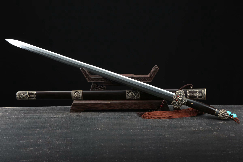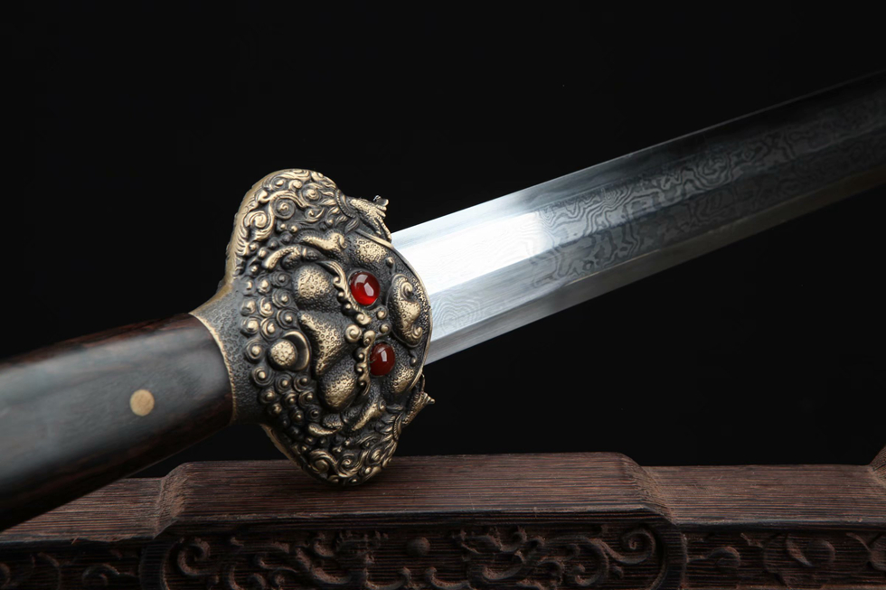 装具:纯铜精雕、做旧;剑鞘:优质黑檀木;剑身:百炼花纹钢05881370。花纹钢烧刃另加155。