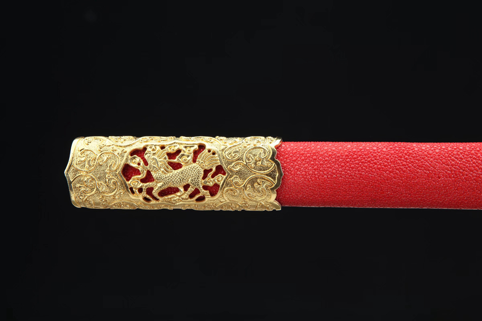 镀金麒麟吉祥唐剑(红色鱼皮款)。