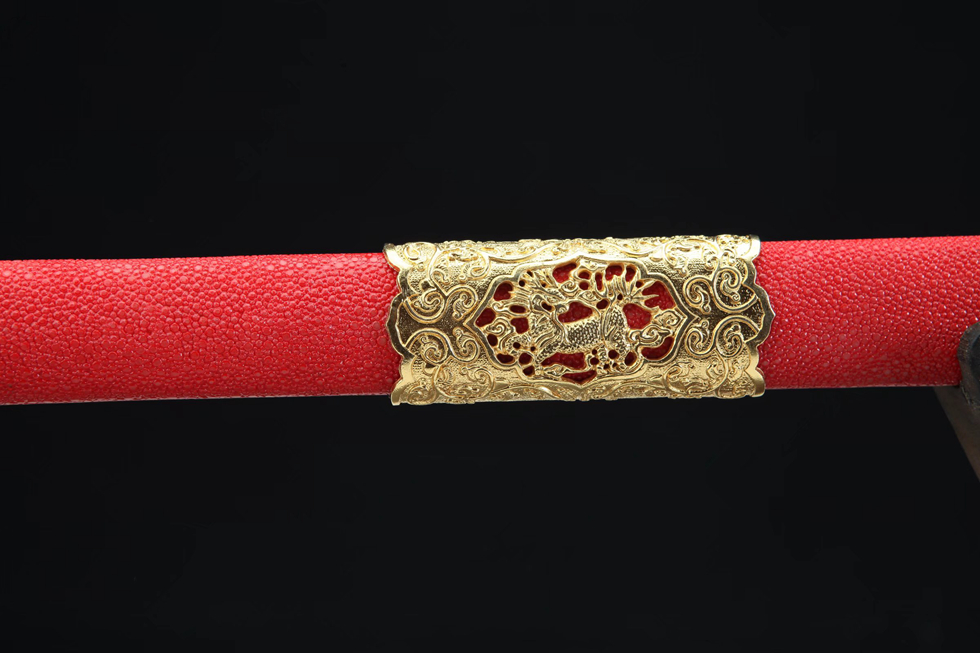 装具:纯铜镂空精雕、精细打磨、镀24k真金;剑鞘:红色粗颗粒真鱼皮;剑身:手工百炼花纹钢、