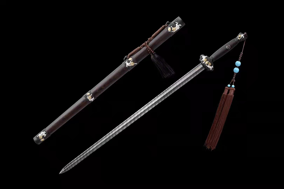 尺寸、全长100cm 、韧长76cm 柄长26cm 韧宽3.7cm,厚0.85cm 、带鞘全重1.85Kg、净重1.36Kg、收藏 防身 乔迁送礼 武术健身 精美摆设、材质:扭转天星瓦面钢研磨剑、纯手工雕刻全铜仿古鎏金银精修装具、精细作工、鞘材:正宗黑檀木,高端送礼首选、赠送锦盒刀油