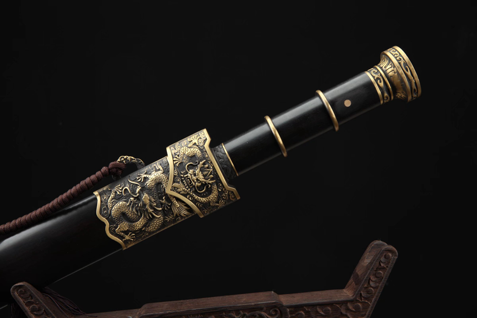 装具:纯铜精雕、精细打磨、做旧;剑鞘:优质黑檀木;