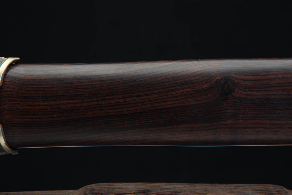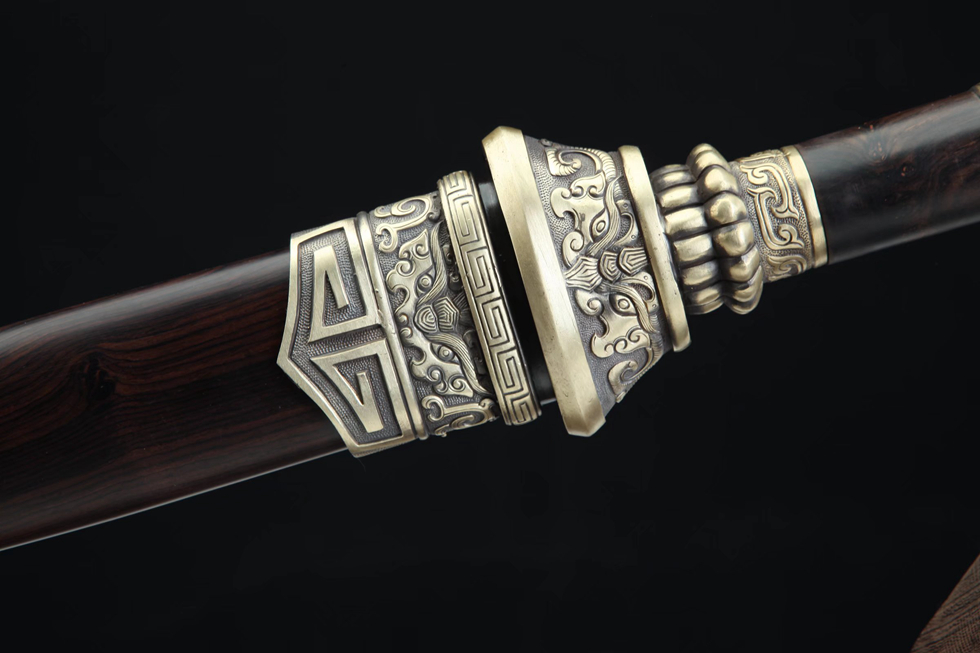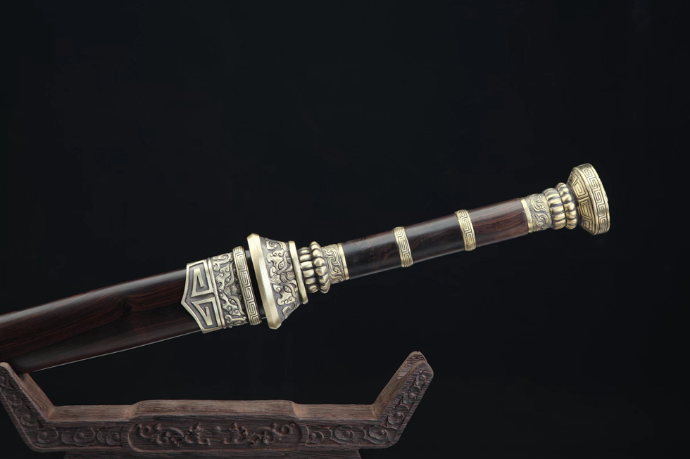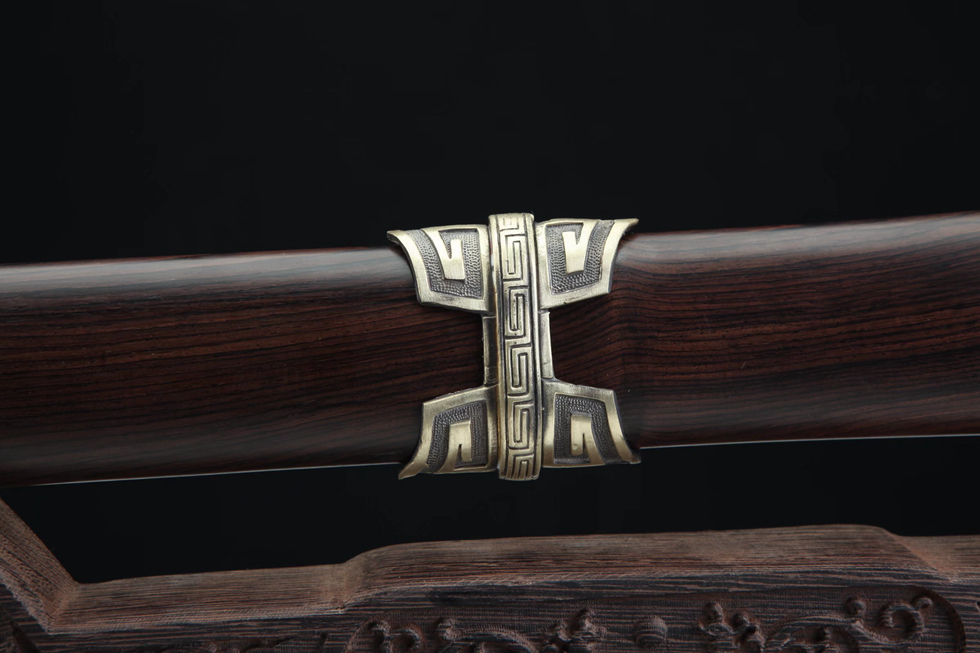 装具:纯铜精雕、精细打磨、做旧;剑鞘:优质黑檀木;