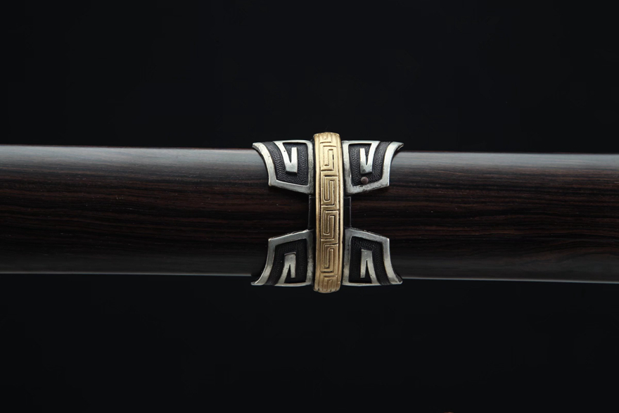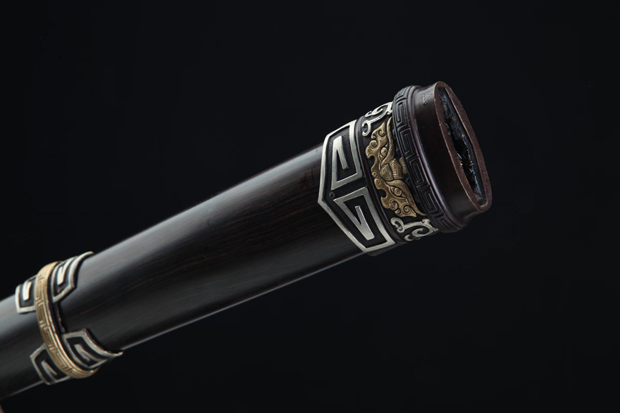 装貝:纯铜精雕、古法鎏金、银、铜三色;剑梢:优质黑檀木;