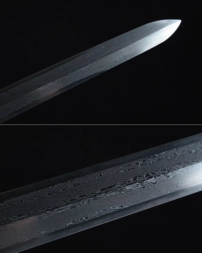 剑鞘:龙泉木包绿色粗颗粒鱼皮;剑身:百炼花纹钢、精细手磨19943000。花纹钢烧刃另加155。