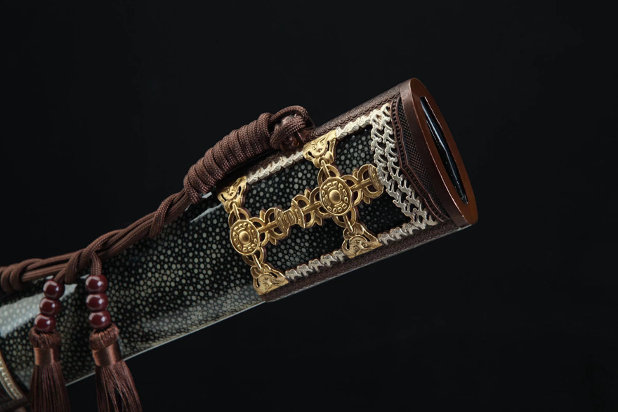 剑鞘:包黑色真鱼皮;剑身:百炼花纹钢、手工锻造、精细手磨20033570。花纹钢烧刃另加125。