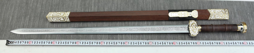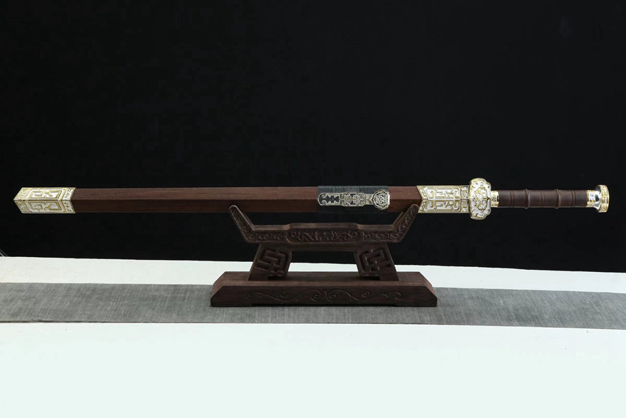 装具:合金装、镀双色;剑鞘:优质鸡翅木;