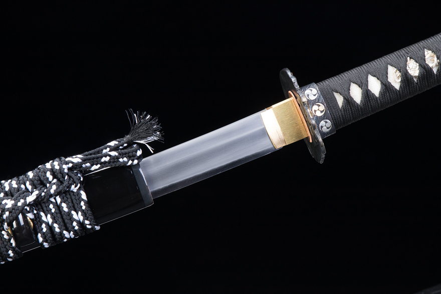 鎏金银“武士道”打刀。60666000全长:104cm 除鞘长:101.5cm刃长:74cm 柄长:28cm刃宽:3cm 刃厚:0.8cm总重:1.34kg 除鞘重:1.06kg刀装具:纯铜精雕、古法鎏金、银、古铜三色;刀鞘:镶贝油漆鞘;刀身:乌兹钢烧刃