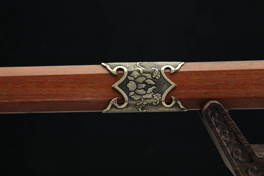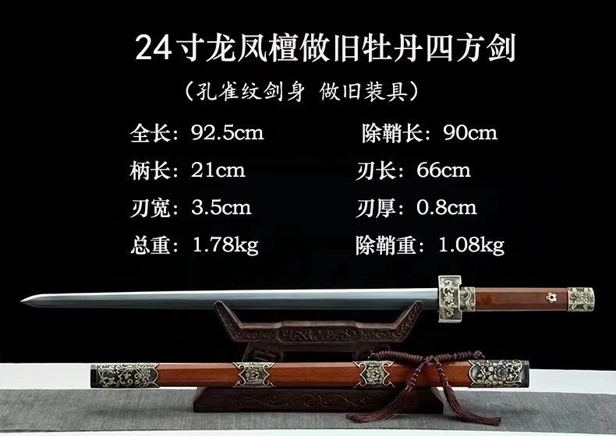 装具:纯铜精雕、做旧;剑鞘:优质龙凤檀木、八面几何设计;剑身:百炼孔雀纹剑身20221750。