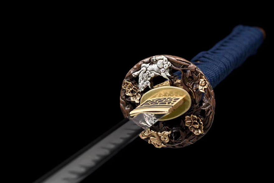 26寸T10烧刃日式上研武士刀【貔貅】20221620〖性能〗手工18道研磨纯锋利,镜面研磨工艺!硬度60°砍铁不伤刃,刚柔相济!超高性价比高!作品总长103cm、刃长71cm、柄长27cm、刃宽3.2cm。刀刃采用T10钢上研,纯手工古法工艺锻打制作,纯铜精雕鎏金银套装,实木大漆鞘搭配精美粗下绪
