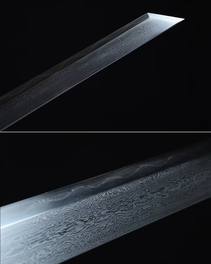 剑柄:粗颗粒真鱼皮;剑身:百炼花纹钢、手工锻造、精细手磨20451620。花纹钢烧刃另加155。