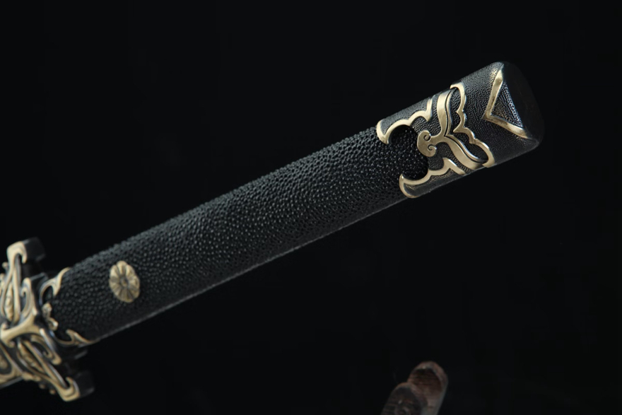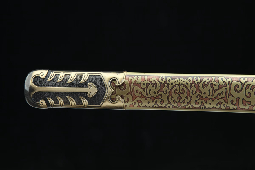 剑鞘采用纯铜手工包铜、刻花,将木梢用铜皮包上后起到防潮防湿、禁锢剑装作用、既美观又不会因天气、时间久远而收缩开裂;