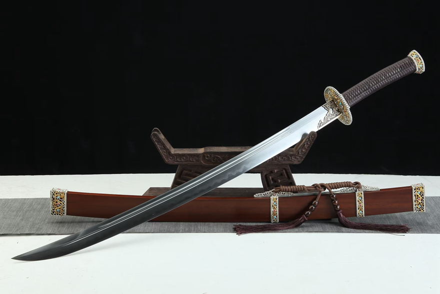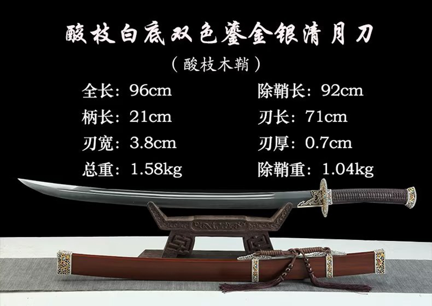 刀鞘:优质酸枝木;刀身:百炼花纹钢、精细研磨20822370。花纹钢烧刃另加155。