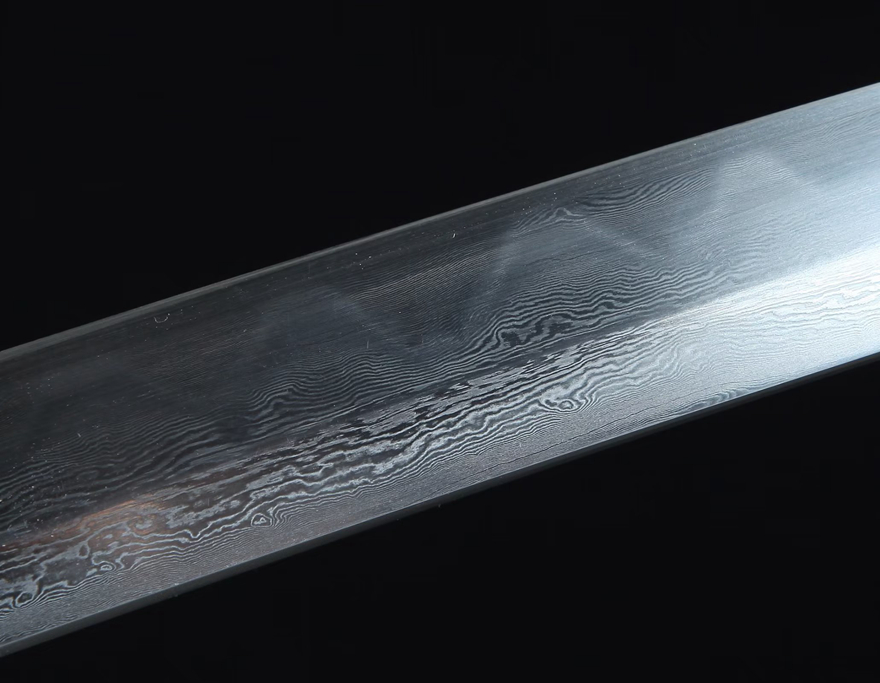 既美观又不会因天气、时间久远而收缩开裂、并古法鎏银;刀柄:附真鱼皮、缠绳;刀身:百炼花纹钢、手工锻造、精细手磨20921500。花纹钢烧刃另加155