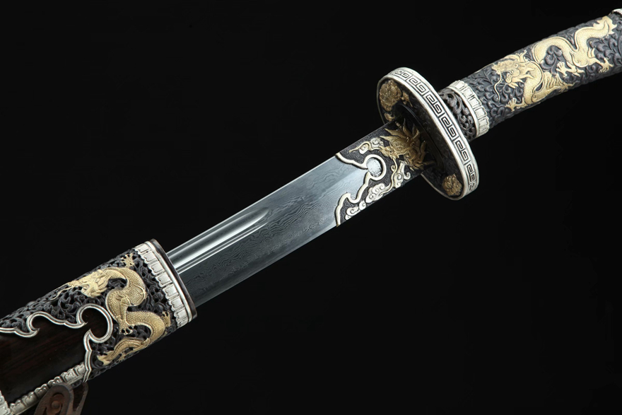 全长:97.5cm 除鞘长:93cm刃长:65.5cm 柄长:20cm刃宽:3.5cm 刃厚:0.7cm总重:3.07kg 除鞘重:1.69kg装貝:纯铜镂空精雕、古法鎏金、银、铜三色;刀鞘:优质黑檀木;刀身:百炼花纹钢、手工锻造、精细手磨12844120。花纹钢烧刃另加155。