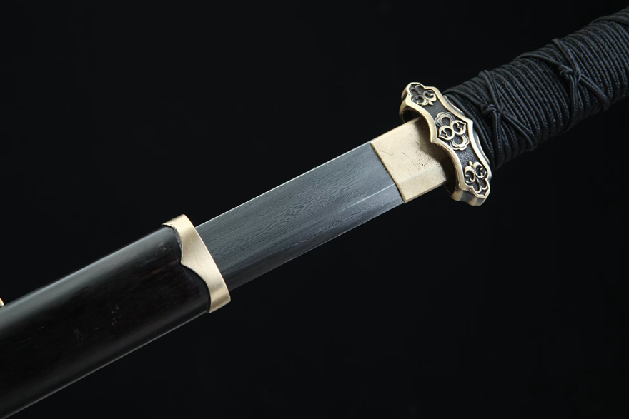 装具:纯铜精雕、精细打磨做旧;刀鞘:优质黑檀木;刀柄:手工缠绳;