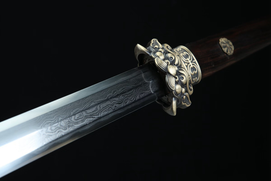 装貝:纯铜精雕、精细打磨、做旧;剑鞘:优质黑檀木;剑身:百炼花纹钢、精细手磨21491430。花纹钢烧刃另加155。