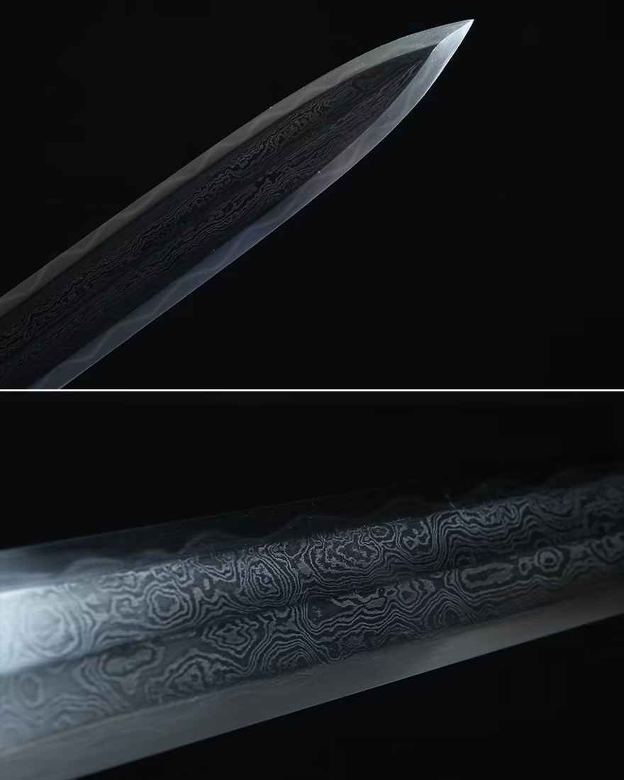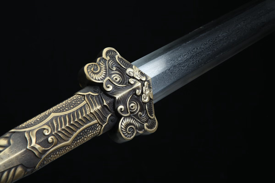 装具:纯铜精雕、做旧;剑鞘:优质酸枝木;剑身:百炼花纹钢21751620。花纹钢烧刃另加155。