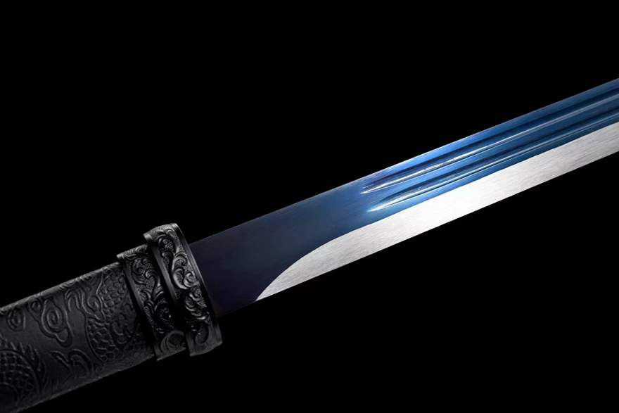 工艺:刀身高性能锰钢一体锻打,刀身开剿烤蓝工艺、手工锻造,经过打坯、铲、24道研磨、粹火,回火、手工研磨龙泉刀剑古法制造工序制作而成,