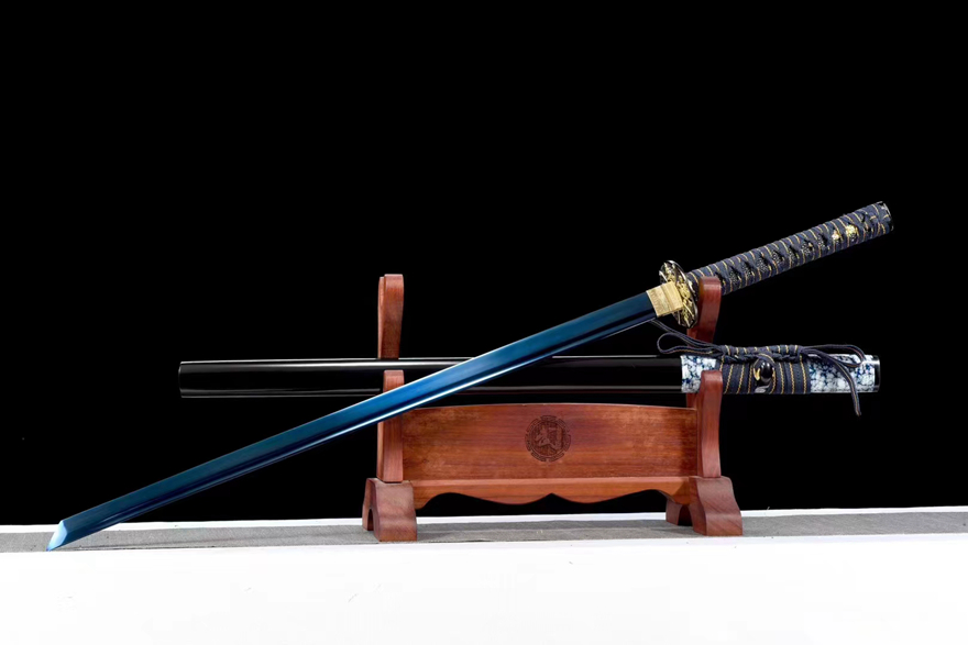 弹簧钢锻打弯曲90度不变形带血槽,刀身采用古法烤蓝工艺处理,硬度高达60°砍铁不伤刃,带鞘全长103厘米,刃长71厘米,柄长26厘米,刃宽3.2厘米,净重1.24千克, 实木大漆鞘, 配高端锦盒