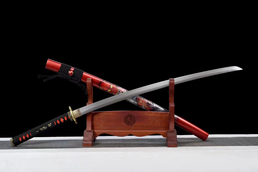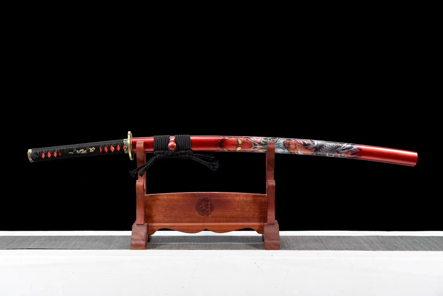 实属强悍 武士刀收藏之佳品?全长:103cm 刃长:72cm 柄长:26cm 刃厚:0.7cm 刃宽:3.2cm 重量约:1.4 KG 刃材:大马士革工艺煅打特有凤尾纹花纹,经多次折叠煅打扭转拉伸,手工18道研磨,刚柔并济,纯铜精雕套装,鞘材:实木刀鞘大漆鞘彩绘,搭配精美粗下绪,手柄:手工绕绳 赠品:高档锦盒。