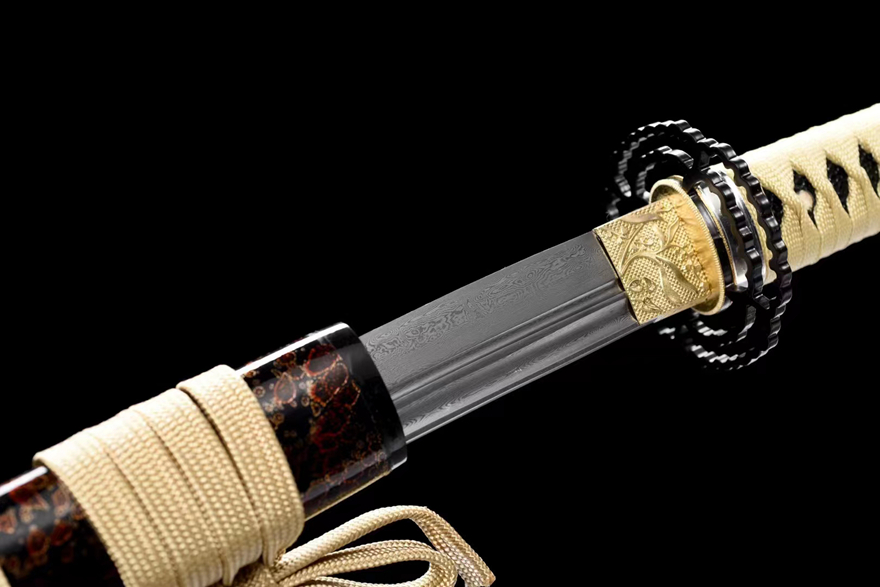 〖性能〗刀身采用百炼花纹钢千锤百炼而成,手工18道研磨纯锋利,开大小槽,镜面研磨工艺!硬度60°砍铁不伤刃,刚柔相济!超高性价比高!带鞘全长103厘米,刃长71厘米,柄长26厘米,刃宽3.2厘米,净重1.28千克;刀装为铁质刀镡;刀鞘为实木大漆滴金鞘,配赠高端锦盒