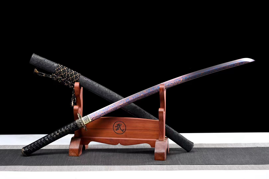 【龙行天下】自炼花纹钢烤蓝武士刀20230700刀身采用百炼花纹钢烤蓝千锤百炼而成,硬度高达60°砍铁不伤刃,刀镡采用纯铜材质雕刻精美图案,韧性极佳弯曲90马上回直,带鞘全长103厘米,刃长71厘米,柄长26厘米,刃宽3.2厘米,配高端锦盒,实木外包龙纹PU皮,十分精致大气