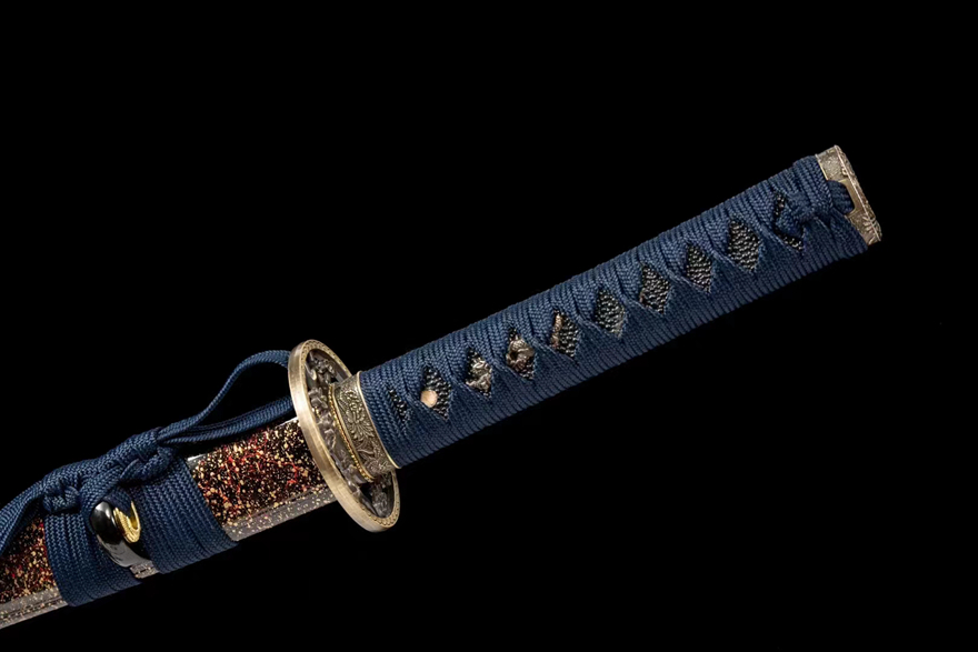 锰钢锻打弯曲90度不变形带血槽,刀身烤蓝工艺处理,刃口全手工【推磨研白双线】处理硬度高达60°砍铁不伤刃,带鞘全长78厘米,刃长52厘米,柄长23厘米,刃宽3.2厘米。实木漆鞘搭配精美下绪,赠高端锦盒