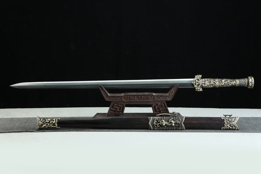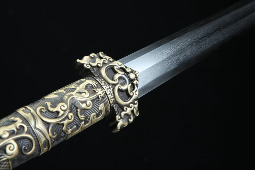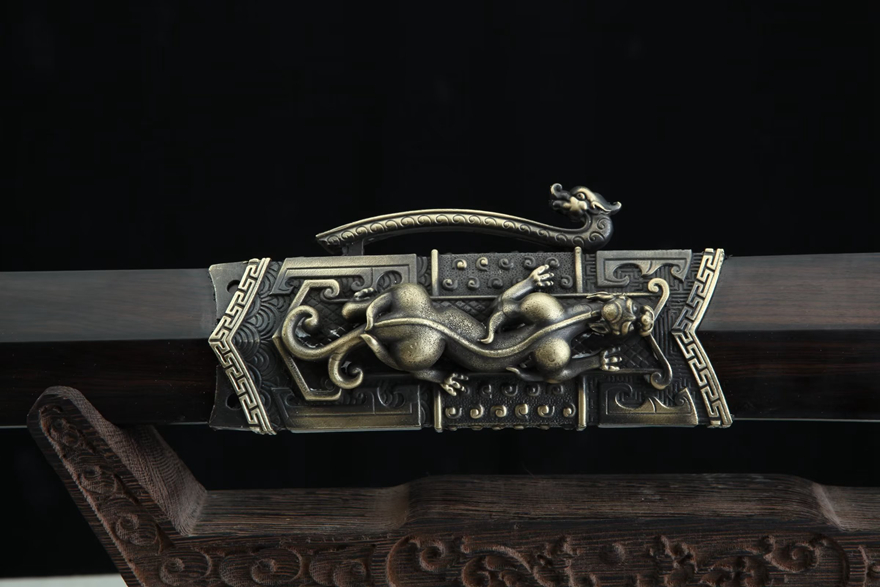 装貝:纯铜精雕、立体设计、层次分明、立体感强、精细打磨、做旧;剑鞘:优质黑檀木;