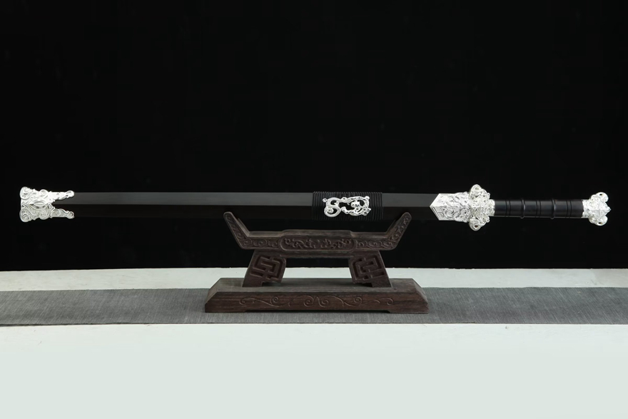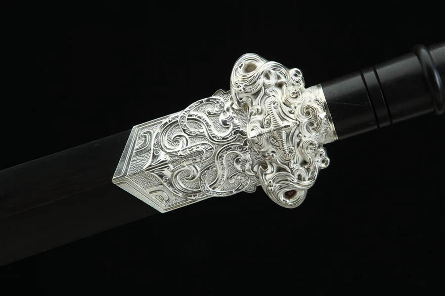 装貝:纯铜精雕、精细打磨、镀银;剑鞘:优质黑檀木;