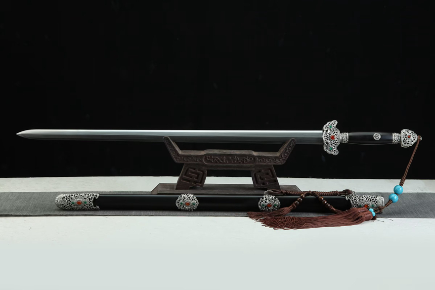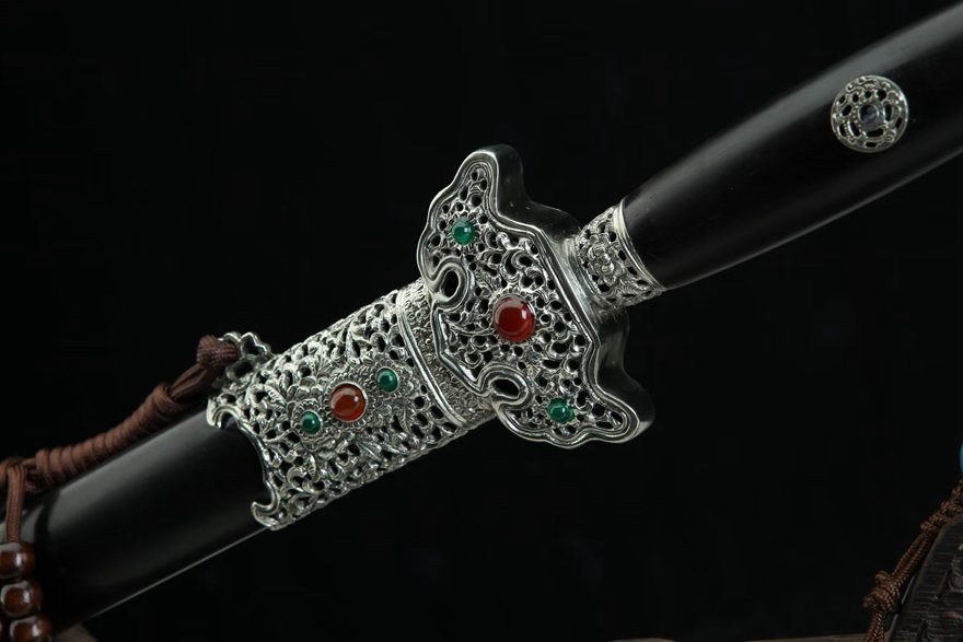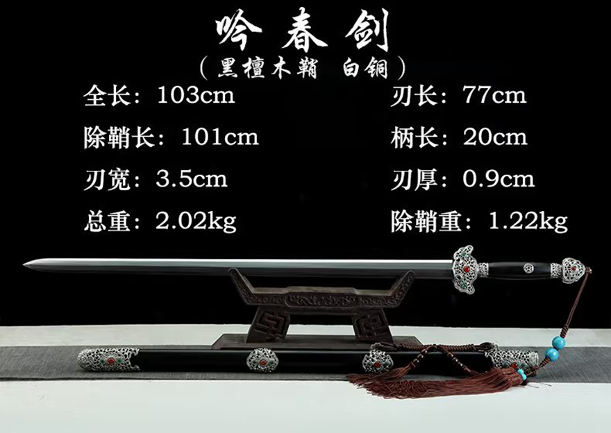 装貝:纯白铜精雕、精细打磨、镶嵌真玉石、亮白铜;剑鞘:优质黑檀木;