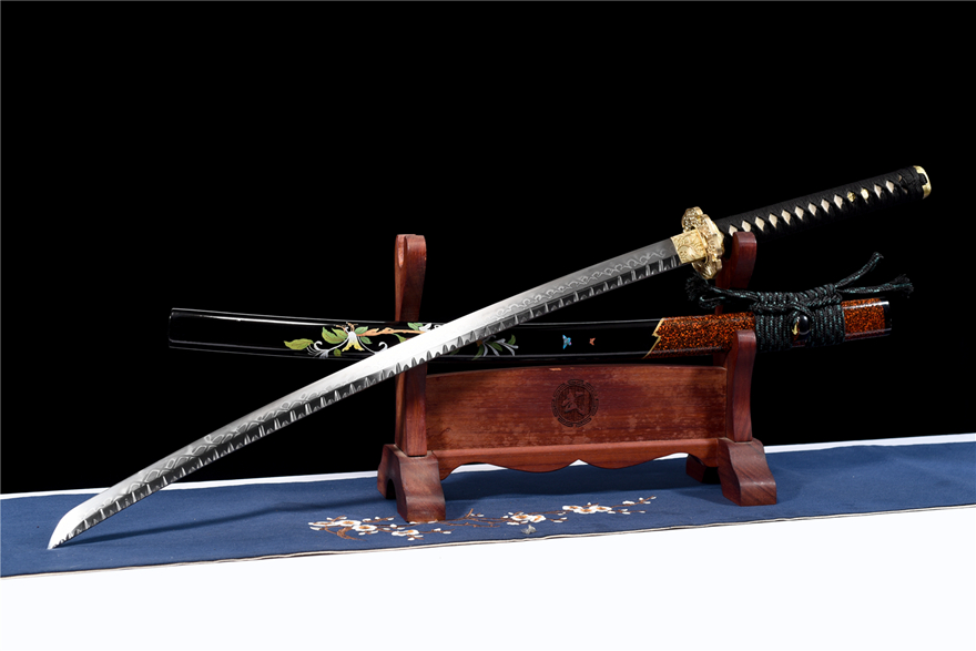 硬度60°砍铁不伤刃,刚柔相济!超高性价比高!带鞘全长103厘米,刃长71厘米,柄长26厘米,刃宽3.2厘米,重量约1.38千克。刀身采用T10钢手工锻打保留原始煅打石纹,敷土烧刃(XX纹),纯铜精雕套装,手柄真鱼皮,实木大漆鞘彩绘搭配精美粗下绪,配赠高端锦盒