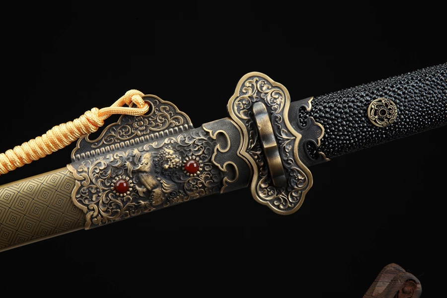装具:纯铜精雕、精细打磨做旧;刀鞘:纯铜手工包铜、刻花,将木梢用铜皮包上后起到防潮防湿、禁锢剑装作用、
