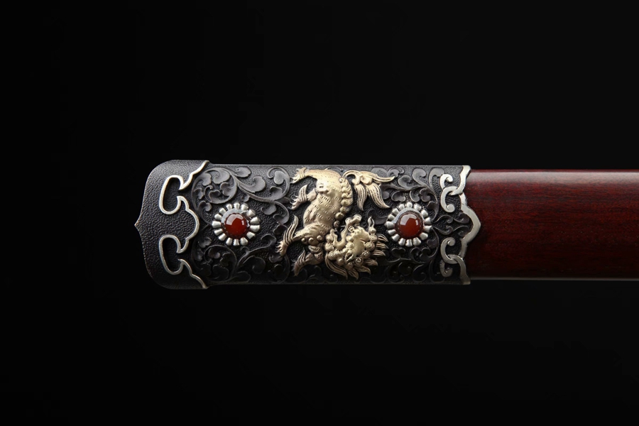 装具:纯铜精雕、古法鎏金、银、古铜三种颜色、镶嵌红色玉宝石;